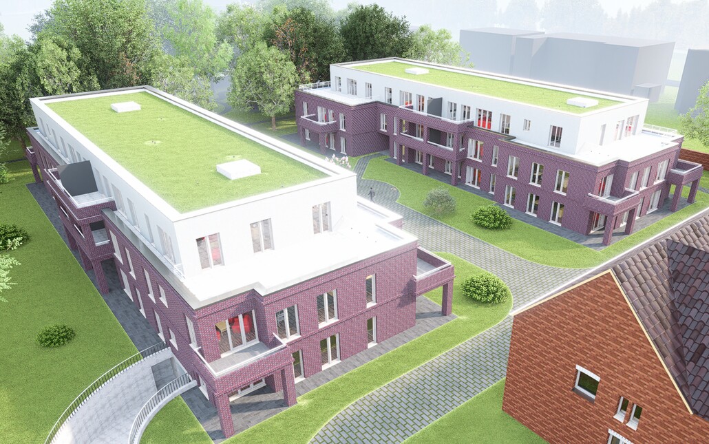 Zwie kleine Eigentümergemeinschaften. mit jeweils sechs individuellen Eigentumswohnungen. Alle Einheiten sind mit dem Aufzug schwellenfrei erreichbar und haben eine großzügige Süd-Loggia. Carports mit begrünten Dächern. Bäderausstattung und Fliesen noch frei wählbar.